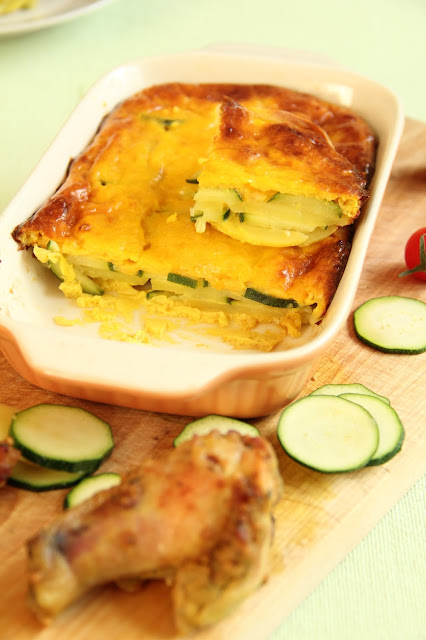 Koori kartulid ning viiluta kartul ja suvikõrvits noaga õhukesteks viiludeks. Lao viilud vaheldumisi võiga määritud ahjuvormi.
